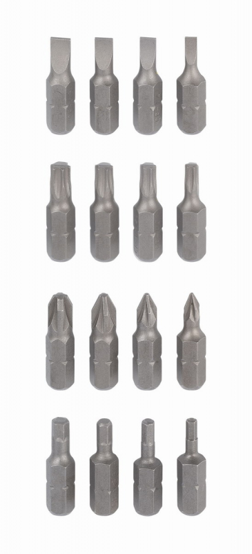 16 různých bitů (4x hex , 4x plochý, 4x Philips® a 4x Torx®)