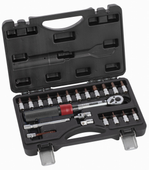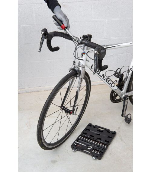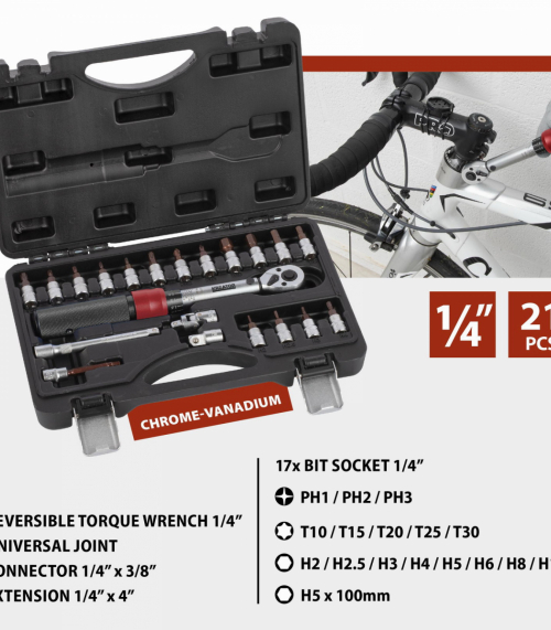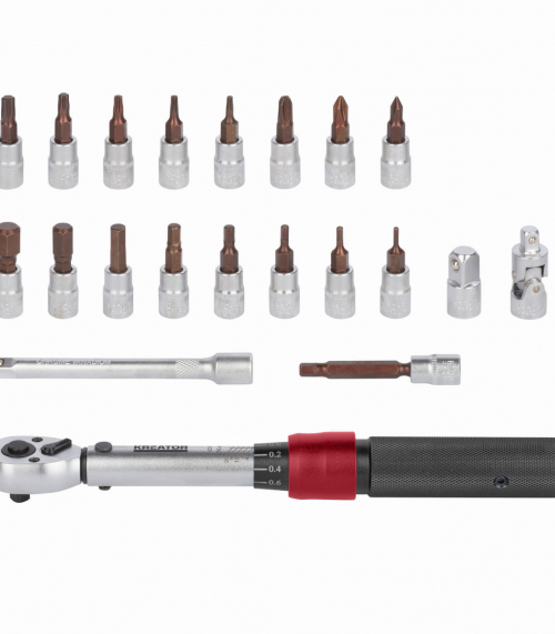 Pokud pracujete s citlivými materiály, je důležité při utahování matic a šroubů použít správnou sílu. Díky této sadě momentových klíčů KRT503101 Kreator můžete pracovat s absolutní přesností. Utahovací moment je snadno nastavitelný (2 – 20 Nm) a cvaknutí, které uslyšíte při utahování, zajišťuje správné utažení matice nebo šroubu. Tento momentový klíč má připojení 1/4” a je ideální pro jemnou práci, např. kola nebo díly motoru. Směr lze také nastavit, takže KRT503101 může utahovat i povolovat matice a šrouby. Hliníková rukojeť činí klíč robustním, ale lehkým pro větší uživatelský komfort. Tato sada je navíc dodávána s 16 bity (T10-T15-T20-T25-T30-H2-H2.5-H3-H4-H5-H6-H8-H10-PH1-PH2-PH3), 100 mm H5 bit, nástavec, univerzální kloub pro úhelníky a adaptér 1/4” na 3/8”. Vše, co potřebujete k přesné práci, se dodává v praktickém úložném kufříku, který drží všechny díly pohromadě a zároveň chrání momentový klíč, takže zůstane správně kalibrovaný. Tento momentový klíč je určen pro fandy. Pro profesionální použití se doporučuje klíč nechat zkalibrovat a poté jej nechat každoročně překalibrovat.