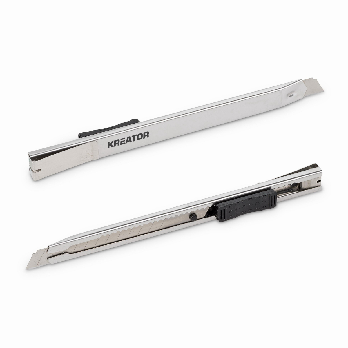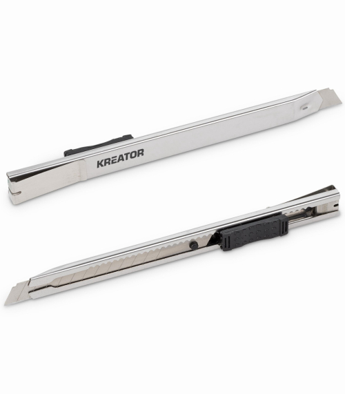S tímto ostrým odlamovacím nožem KRTH00103 od Kreator vyrobeným z odolné nerezové oceli snadno řežete papír, karton, tapety, pásky a další. Čepel můžete zaaretovat pomocí zajišťovacího mechanismu, abyste zajistili bezpečnost při práci. Čepel má délku 80 mm a šířku 9 mm. Když je čas na novou, ostřejší čepel, můžete jednoduše odlomit tupou část.