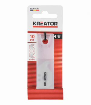 Toto je 10dílná sada náhradních čepelí KRTH00302 od Kreator pro pracovní nože. Tyto zahnuté čepele o délce 48 mm a šířce 18 mm lze snadno vyměnit. Jsou ideální pro řezání silných materiálů, jako jsou koberce, vinyl a střešní krytiny.