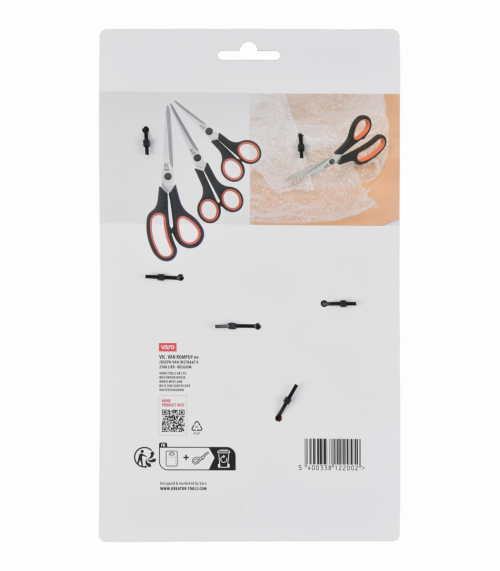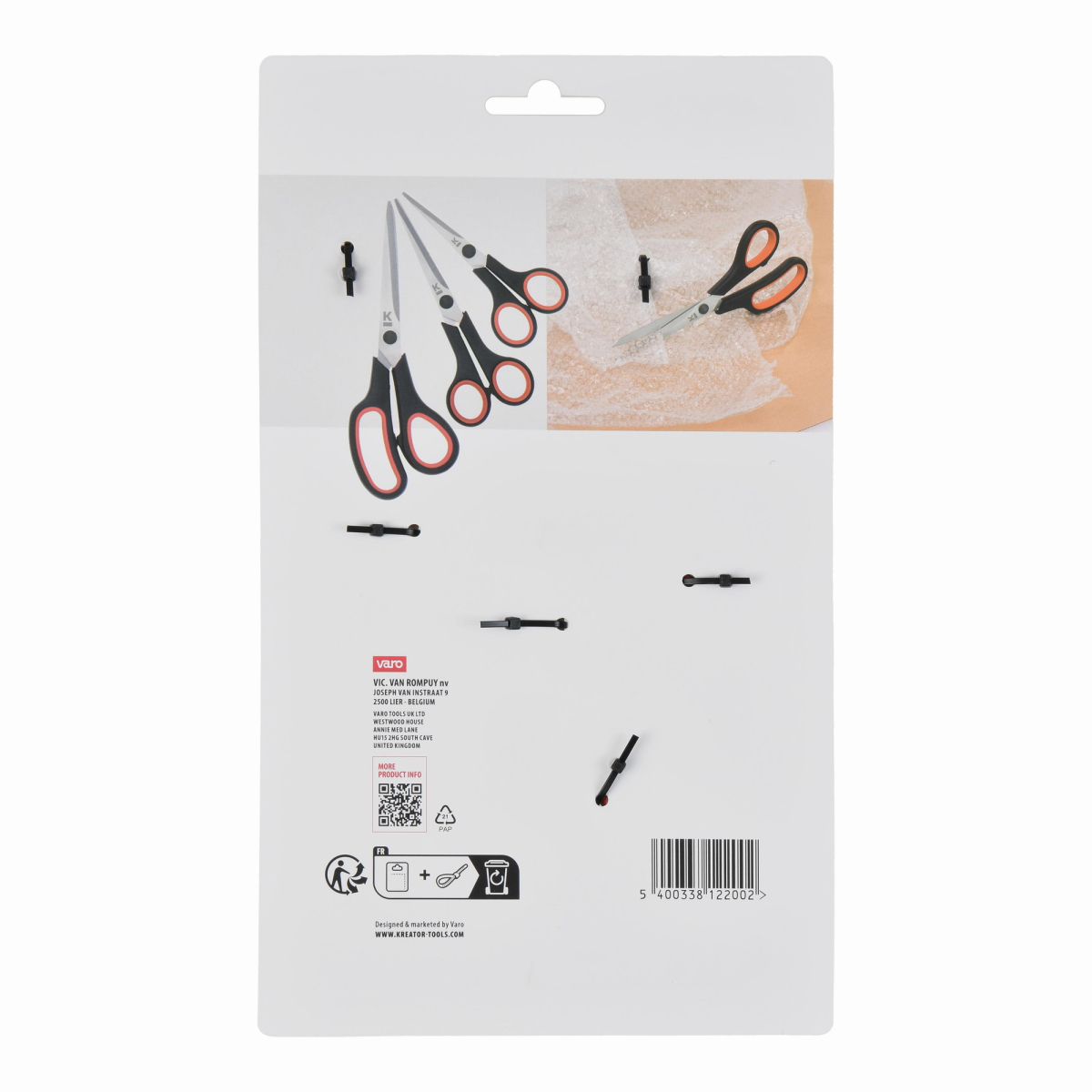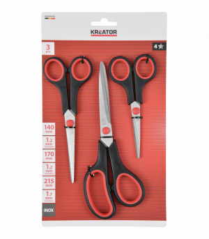 Tato sada KRTH00405 od Kreator se skládá ze 3 kusů nůžek o délce 215, 170 a 140 mm. Jsou vyrobeny z leštěné nerezové oceli a lze je mýt v myčce nádobí. Čepele mají tloušťku 1, 2 a 1,7 mm. Nůžky jsou vybaveny pevnými plastovými rukojeťmi s měkkými vnitřními kroužky pro pohodlný úchop.