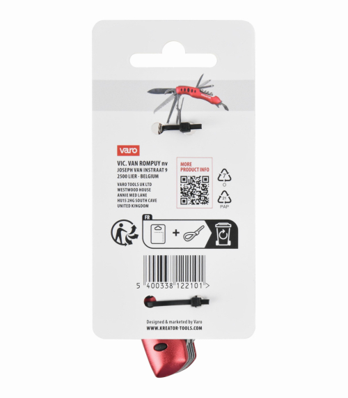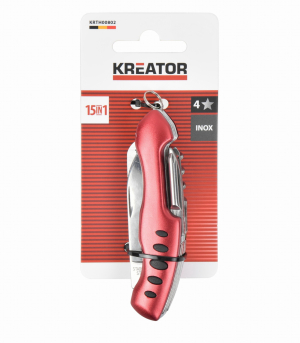 Tento kvalitní kapesní nůž KRTH00802 od Kreator z nerezové oceli nabízí minimálně 15 různých funkcí. Je vybaven nůžkami, vývrtkou, otvírákem na lahve, šroubovákem, pilníkem na nehty a pilou. Má štíhlý, ergonomický tvar. Pevný a přitom lehký kapesní nůž z hliníku měří po složení 9 cm a snadno se vejde do kapsy nebo tašky.