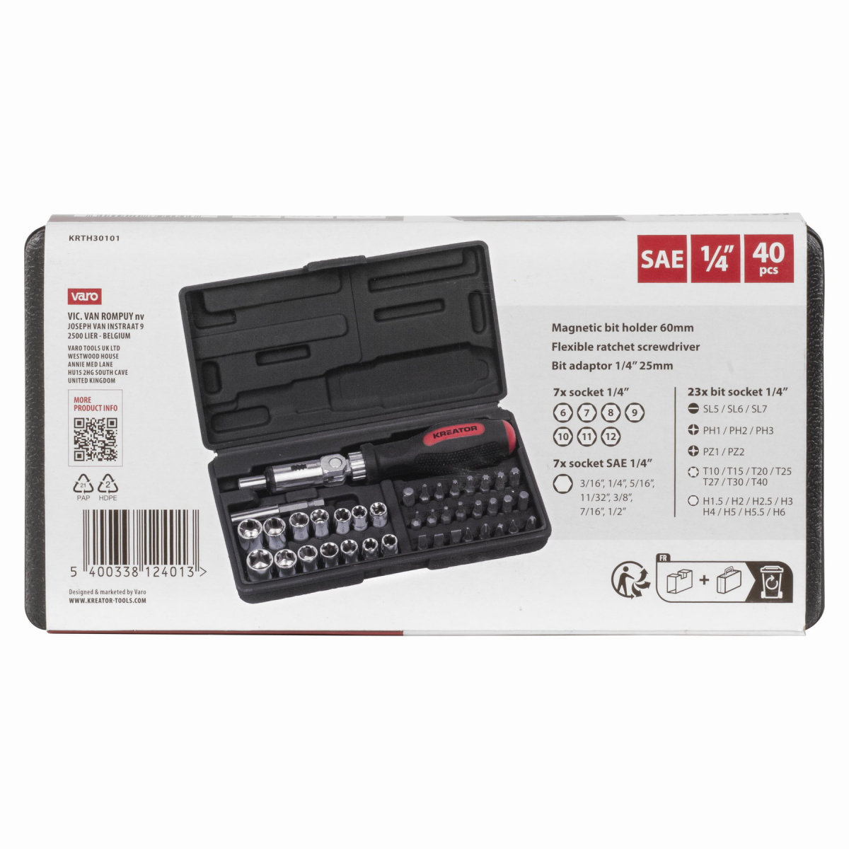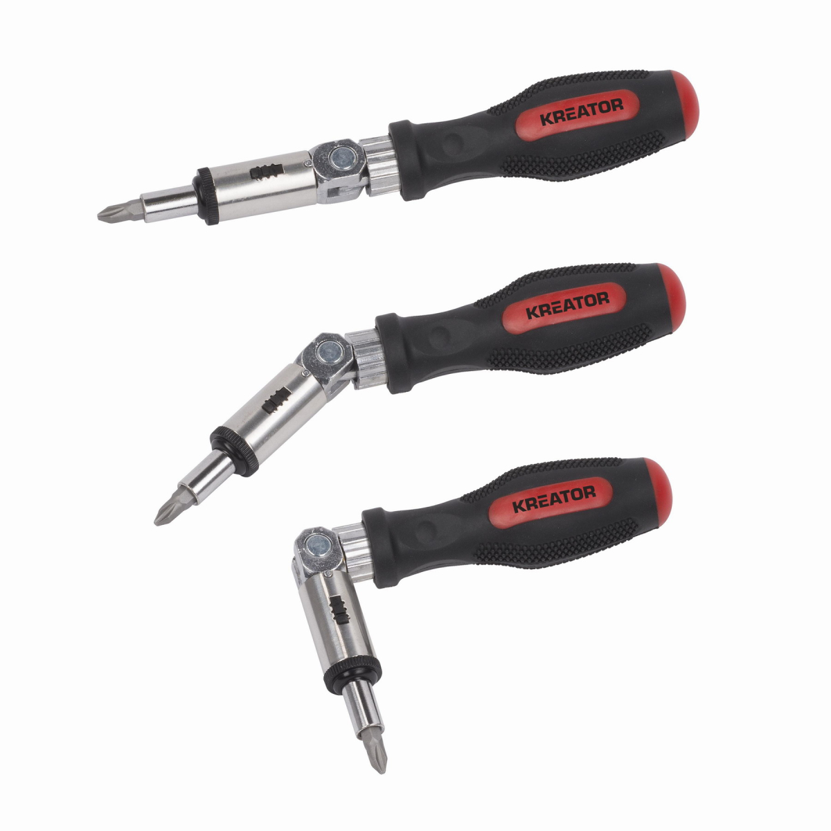 Jedná se o rozsáhlou 40dílnou sadu ráčnového šroubováku KRTH30101 z naší řady Kreator. Hlavu lze naklápět, což poskytuje potřebnou flexibilitu a umožňuje vyvinout větší sílu. Kromě flexibilního ráčnového šroubováku s ergonomickou rukojetí s měkkým úchopem a protiskluzovým povrchem obsahuje sada také 14 nástrčných klíčů, 23 šroubovacích bitů, magnetický držák bitů a adaptér pro bity. Sada je dodávána v praktickém úložném pouzdře.