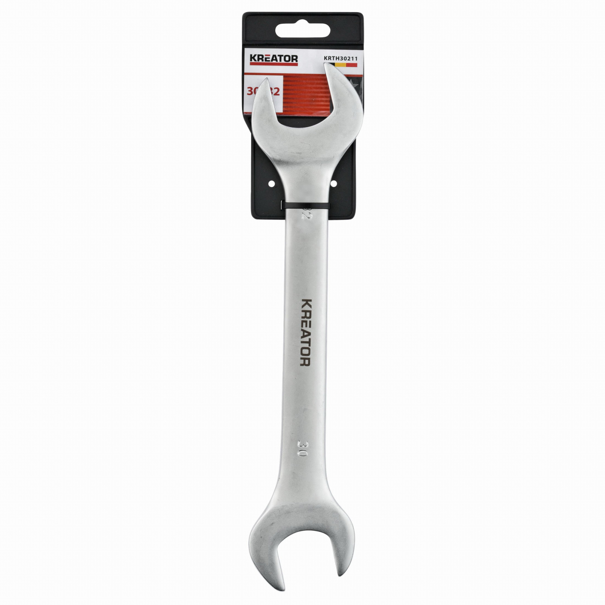 Tento dvojitý otevřený klíč KRTH30211 značky Kreator má délku 280 mm a je vyroben z vysoce kvalitního chrom-vanadiového slitiny. Konce mají otvory různých velikostí. Jeden je široký 30 mm a druhý 32 mm.