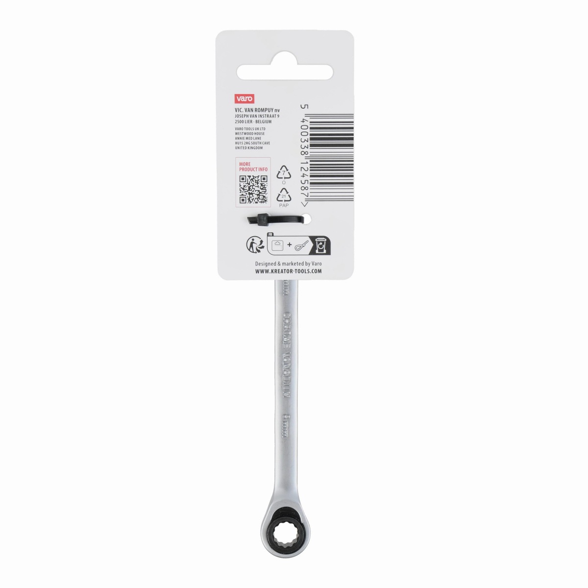 Tento kombinovaný očko ráčna / otevřený klíč KRTH30501 od Kreator je vyroben z vysoce kvalitní chrom-vanadiové slitiny. Délka klíče je 135 mm a má průměr 8 mm. Očko je opatřeno kvalitním strojkem, který má 72 zubů.