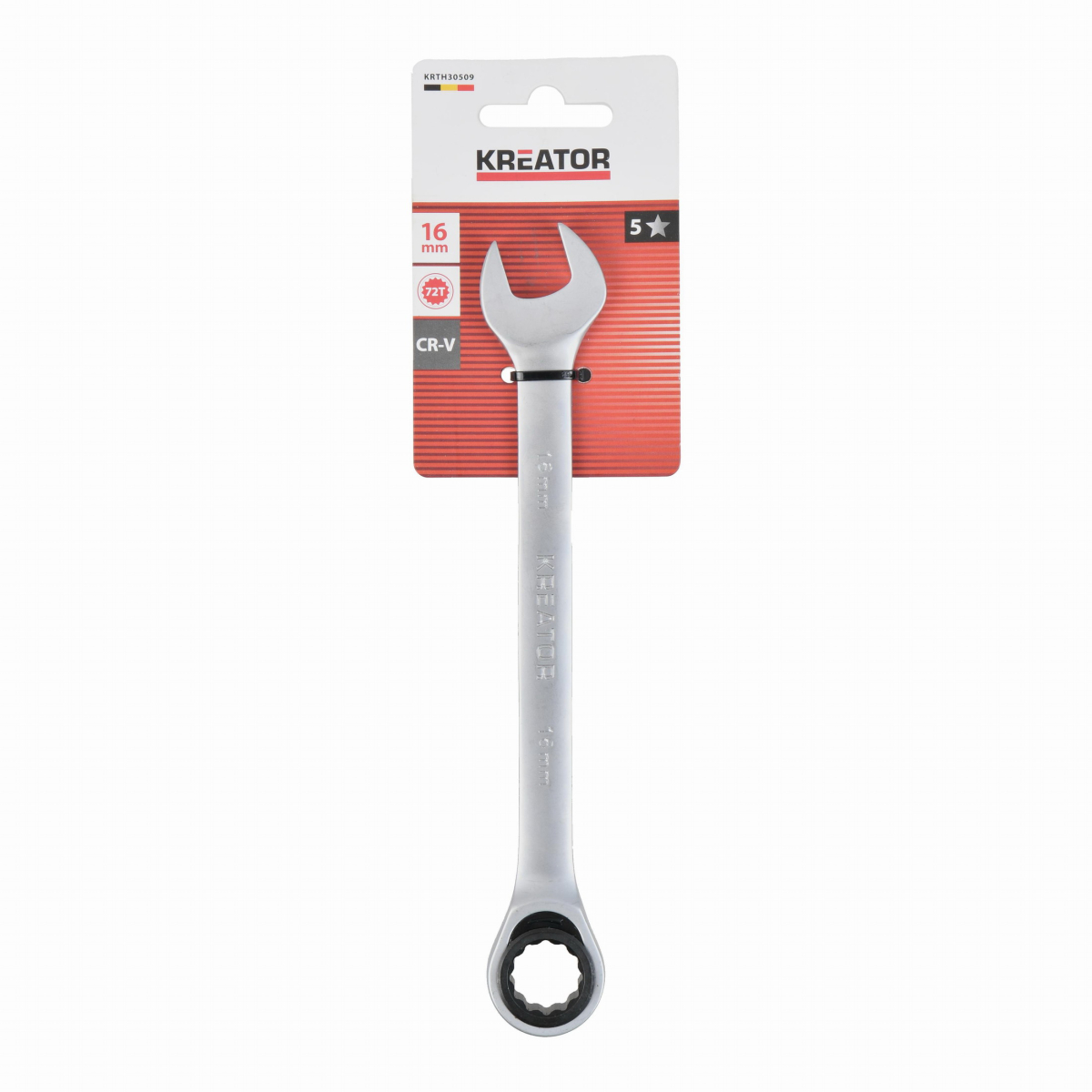 Tento kombinovaný očko ráčna / otevřený klíč KRTH30509 od Kreator je vyroben z vysoce kvalitní chrom-vanadiové slitiny. Délka klíče je 207 mm a má průměr 16 mm. Očko je opatřeno kvalitním strojkem, který má 72 zubů.