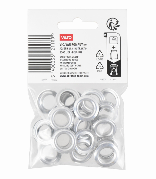 Tyto nýtovací očka KRTH62510 od Kreator mají vnitřní průměr 12,5 mm a lze je připevnit k textiliím a jiným tenkým materiálům pomocí kleští na nýtovací očka.