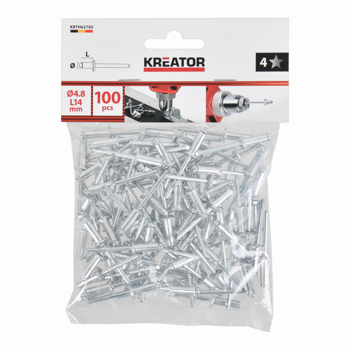 Tyto trhací nýty KRTH62705 z naší řady Kreator mají průměr 4,8 mm. Používejte je k rychlému a bezšroubovému spojení kovových, hliníkových nebo plastových předmětů o tloušťce až 10 mm. To se provádí pomocí nýtovacích kleští. Balení obsahuje 100ks.