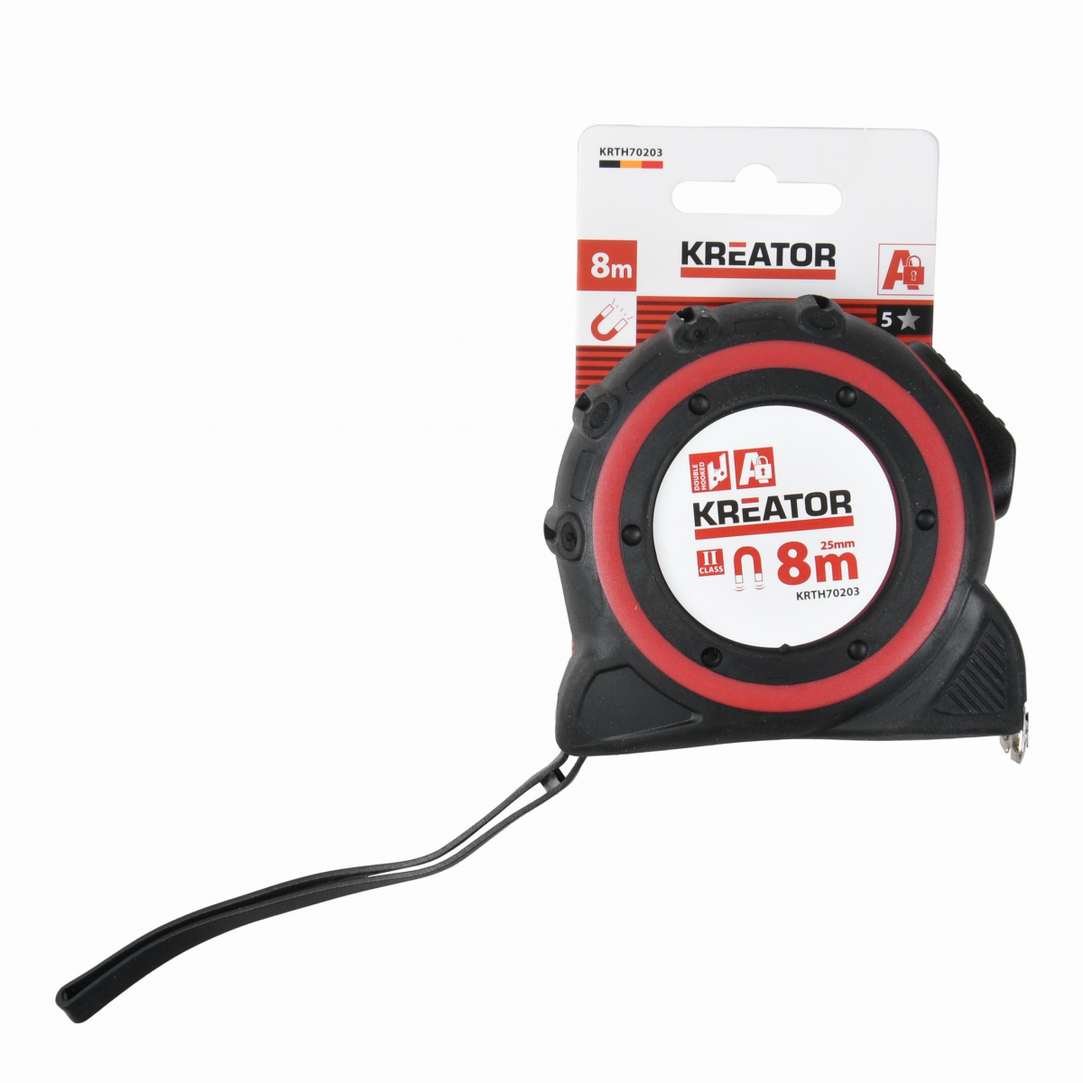 Tento svinovací metr KRTH70203 z naší řady Kreator s magnetickou špičkou má maximální délku 8 m. Zajistěte jej pomocí zajišťovacího tlačítka, aby se během používání nenavíjel. Pokud potřebujete mít volné ruce, můžete si metr snadno připevnit na opasek díky klipu na opasek. Měkký materiál rukojeti s měkkou rukojetí poskytuje větší úchop a pohodlí při používání. . Metr splňuje kategorii MID Class Quality 2.