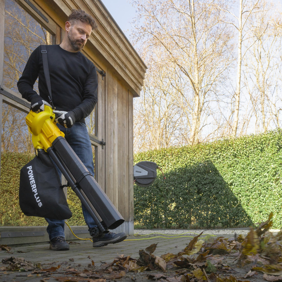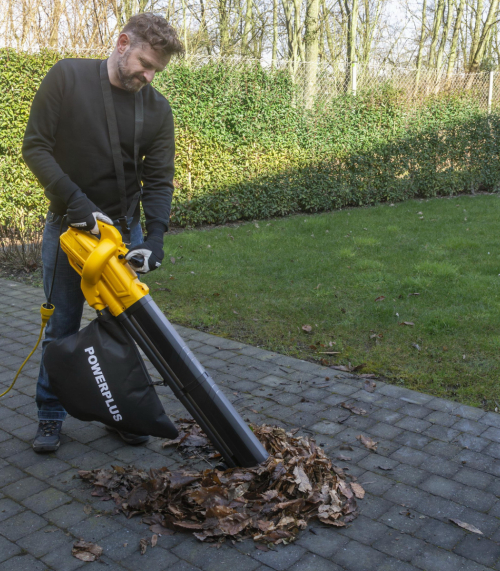 Výkonný elektrický vysavač, foukač listí POWEG4030 od Powerplus pro rychlý a efektivní úklid zahrady. S výkonem motoru 3300 W, rychlostí vzduchu 250 km/h a průtokem vzduchu 10 m³/min snadno odstraníte volné listí a další zahradní nečistoty.