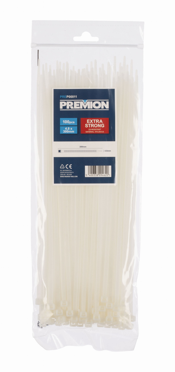 Tato sada PREP00011 od Premion obsahuje 100 ks bílých nylonových stahovacích pásek 4,8 x 300 mm. Tyto extra pevné stahovací pásky mají vysokou pevnost v tahu. Použijte je k úhlednému svázání kabelů nebo ke snadnému vzájemnému spojení předmětů. Úhledně ukryjte kabely a vodiče například ve své kanceláři nebo dílně tím, že je svážete pomocí těchto kabelových stahovacích pásků. Navíc jsou tyto stahovací pásky odolné vůči UV záření.