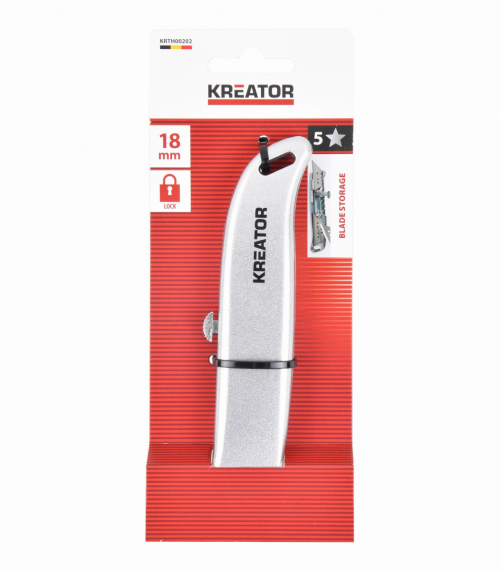 S týmto robustným nožom KRTH00202 od Kreator zo zliatiny zinku ľahko režete koberce, vinyl, strešnú krytinu, obaly a podobne. Môžete použiť rovné aj zahnuté čepele. Pre vašu bezpečnosť sa čepeľ dá po použití okamžite zasunúť späť. Čepeľ môžete zaaretovať pomocou zaisťovacieho mechanizmu.