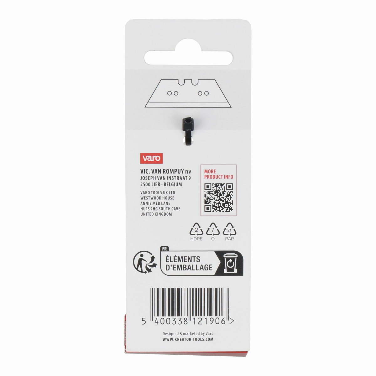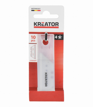 Toto je 10-dielna súprava náhradných čepelí KRTH00301 od Kreator pre pracovné nože. Tieto rovné čepele s dĺžkou 60 mm a šírkou 18 mm je možné ľahko vymeniť. Sú ideálne na rezanie silných materiálov, ako sú koberce, vinyl a strešné krytiny.