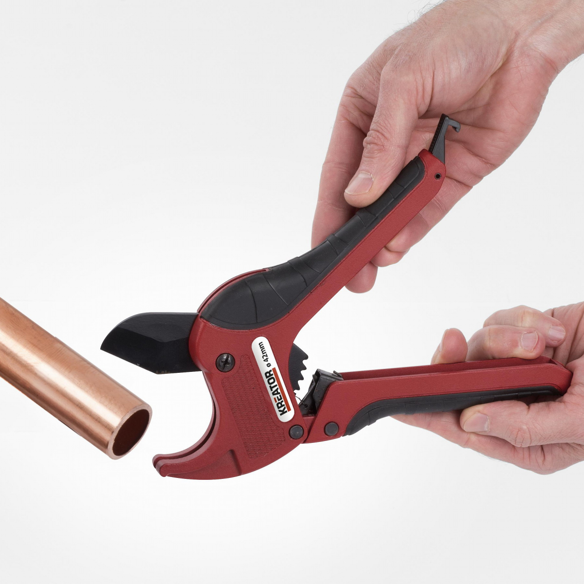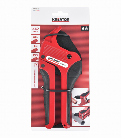 Tieto vysoko kvalitné nožnice KRTH00603 od Kreator na rúrky dokážu bez námahy strihať hliníkové, medené a PVC rúrky s priemerom 3 mm – 42 mm. Priemer je ľahko nastaviteľný, takže môžete bez námahy vykonávať kolmé strihy.