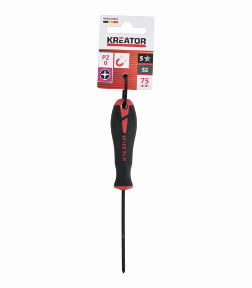 Tento skrutkovač KRTH20901 z nášho radu Kreator má 75 mm dlhú stopku a je vyrobený z vysoko kvalitnej ocele S2. Magnetický hrot PZ0 urýchľuje proces skrutkovania. Mäkká protišmyková rukoväť poskytuje pevný úchop a rukoväť má integrované závesné oko pre ľahké skladovanie.
