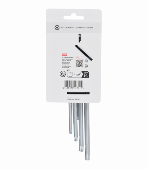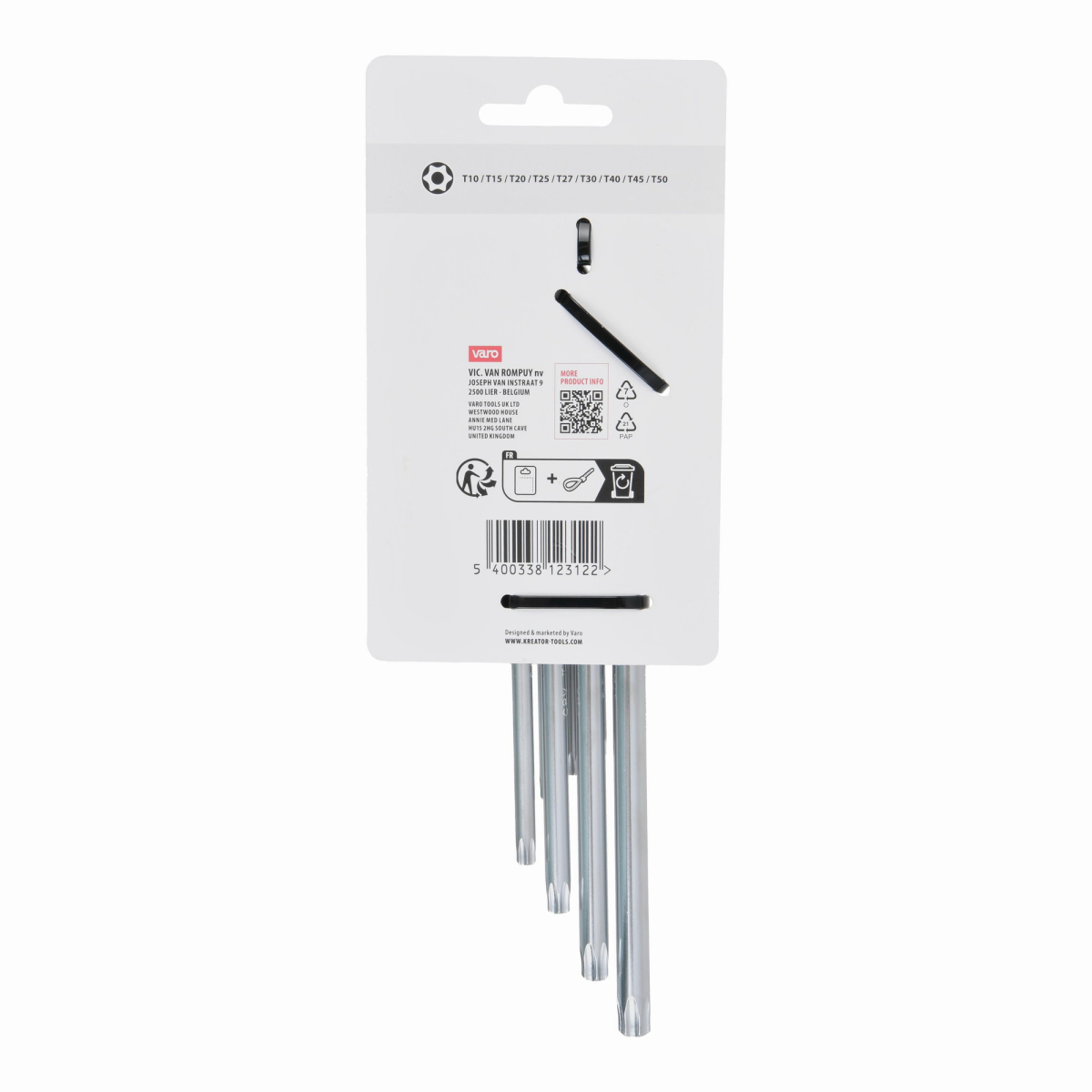 Táto sada KRTH21803 od Kreator obsahuje 9 dlhých imbusových kľúčov v tvare L s priemerom T10 až T50. Kľúče sa dodávajú v praktickom plastovom boxe pre rýchle a jednoduché uloženie.