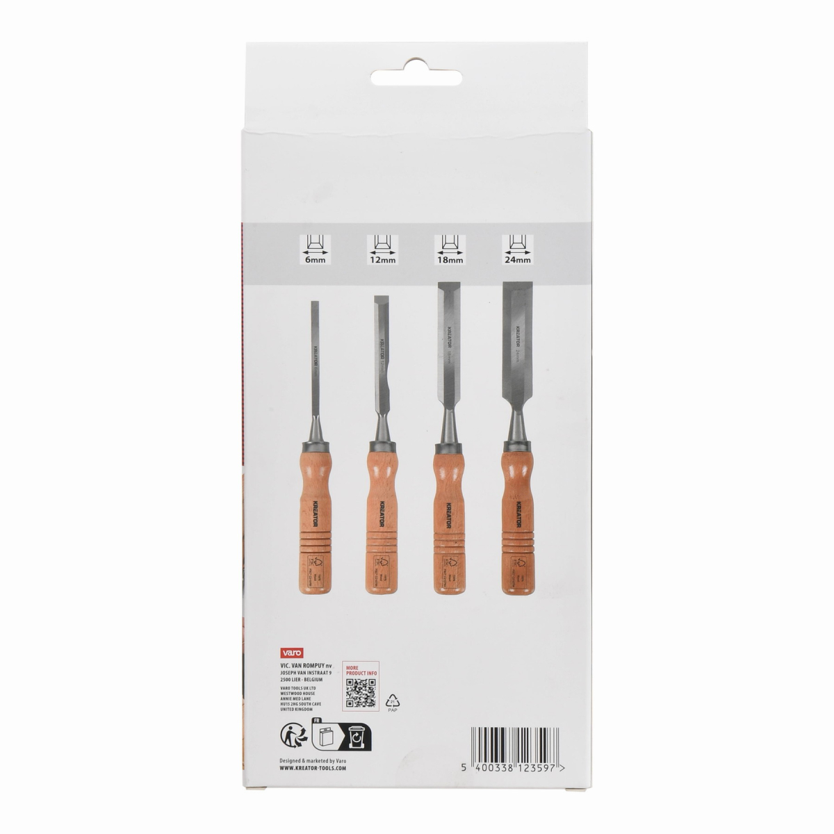 Dláto na drevo je nevyhnutné pre každého majstra, ktorý pracuje s drevom. S týmito 4 plochými dlátami skrutkovač KRTH23603 z nášho radu Kreator na drevo vysekáte do dreva rôzne tvary. Sú 250 mm dlhá a každá čepeľ má inú šírku: 6 / 12 / 18 / 24 mm.