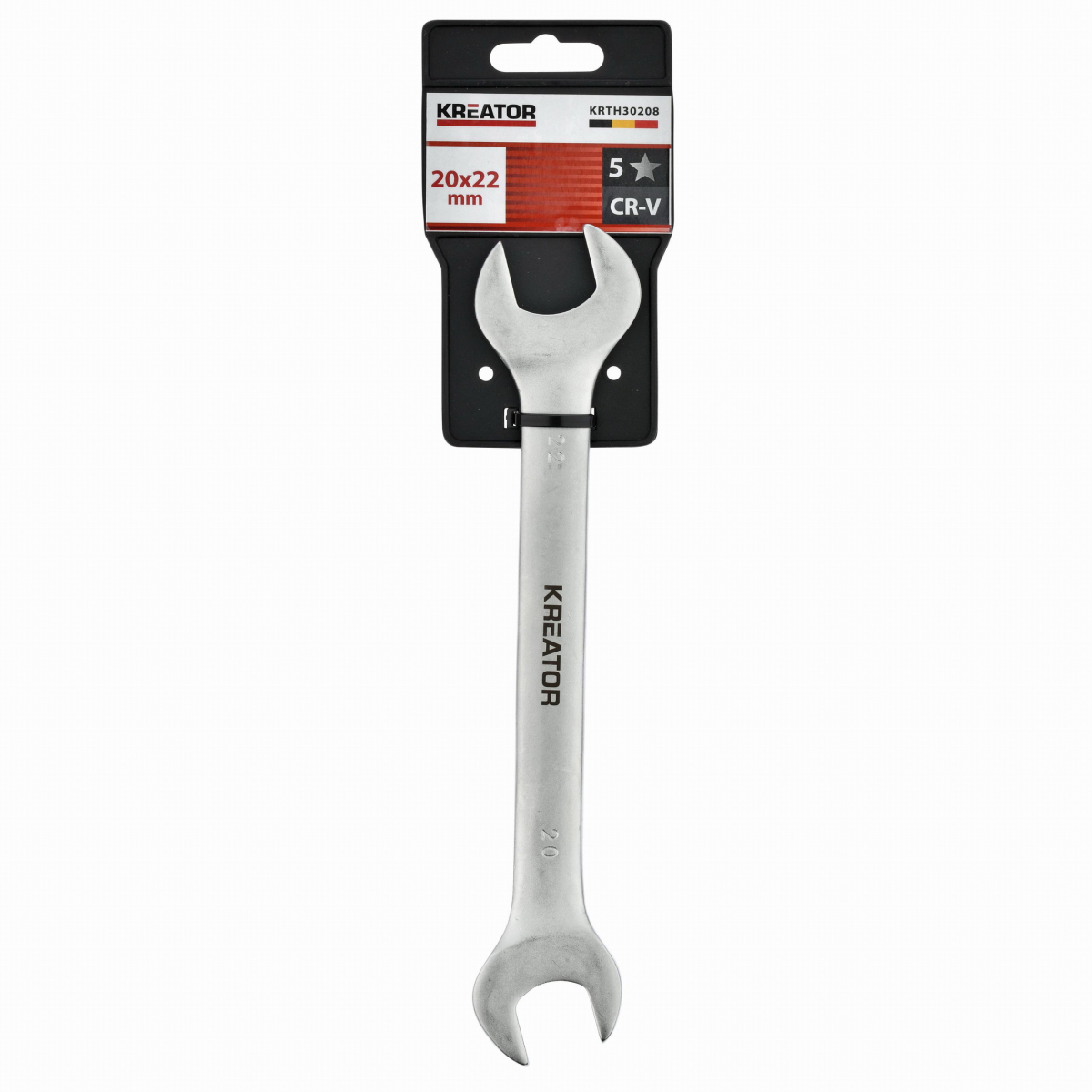 Tento dvojitý otvorený kľúč KRTH30208 od Kreator má dĺžku 225 mm a je vyrobený z vysoko kvalitného chróm-vanádiového zliatiny. Konce majú otvory rôznych veľkostí. Jeden je široký 20 mm a druhý 22 mm.