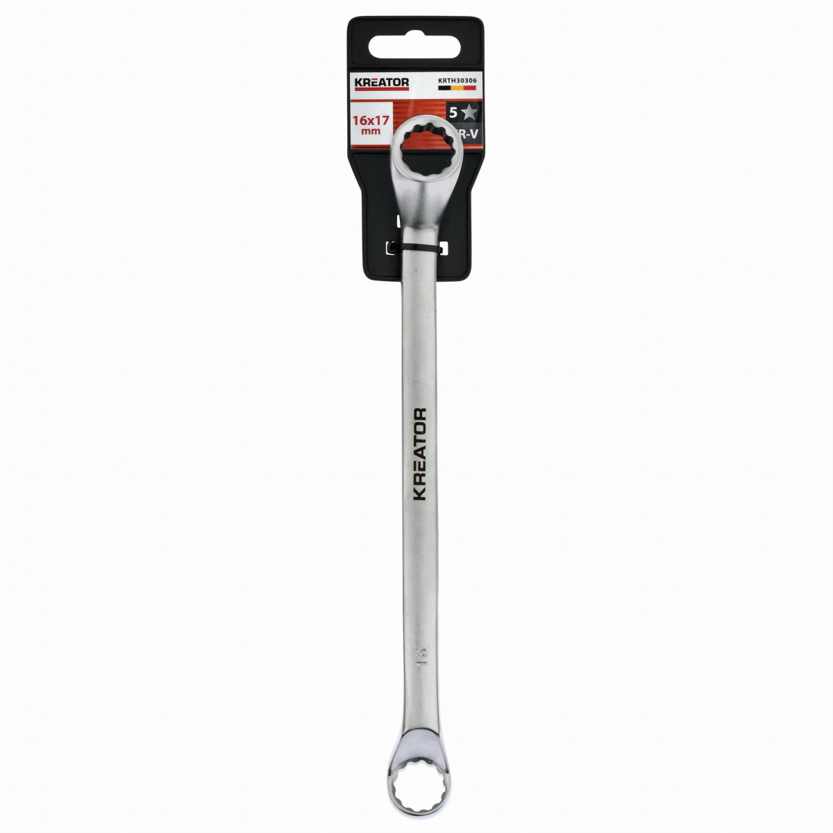 Tento dvojitý očkový kľúč KRTH30306 z nášho radu Kreator má dĺžku 190 mm a je vyrobený z vysoko kvalitnej chróm-vanádiovej zliatiny. Osadené krúžky zaisťujú efektívnejší prenos vyvíjanej sily. Konce majú otvory rôznych veľkostí. Jeden má veľkosť 16 a druhý 17 mm.