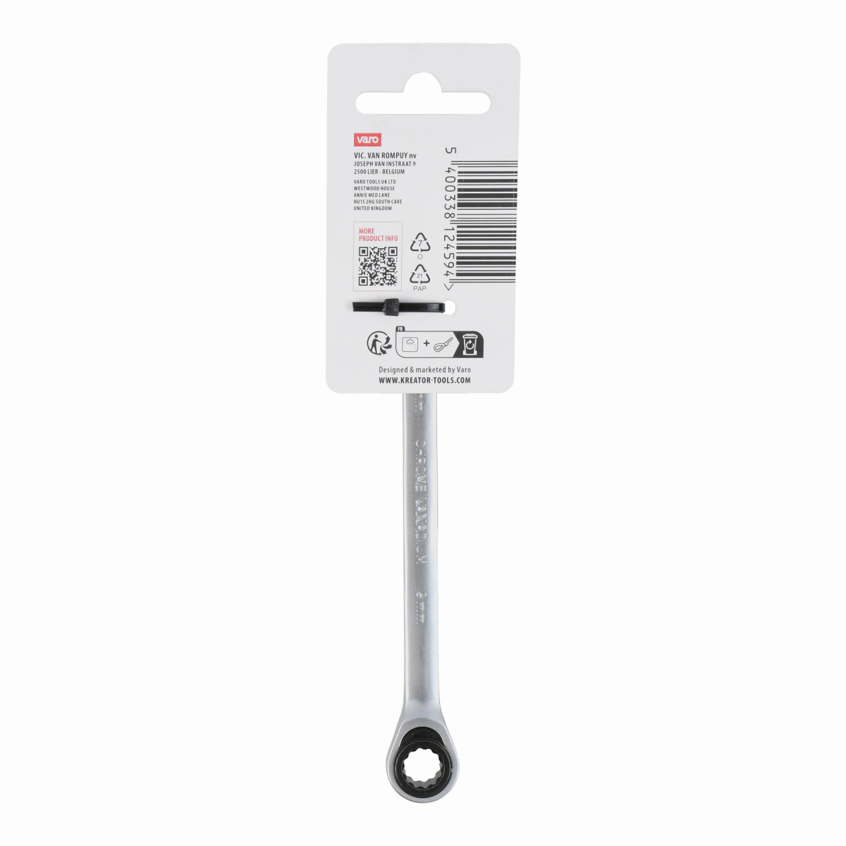 Tento kombinovaný očko račňa / otvorený kľúč KRTH30502 značky Kreator je vyrobený z vysoko kvalitnej chróm-vanádiovej zliatiny. Dĺžka kľúča je 154 mm a má priemer 9 mm. Očko je opatrené kvalitným strojčekom, ktorý má 72 zubov.