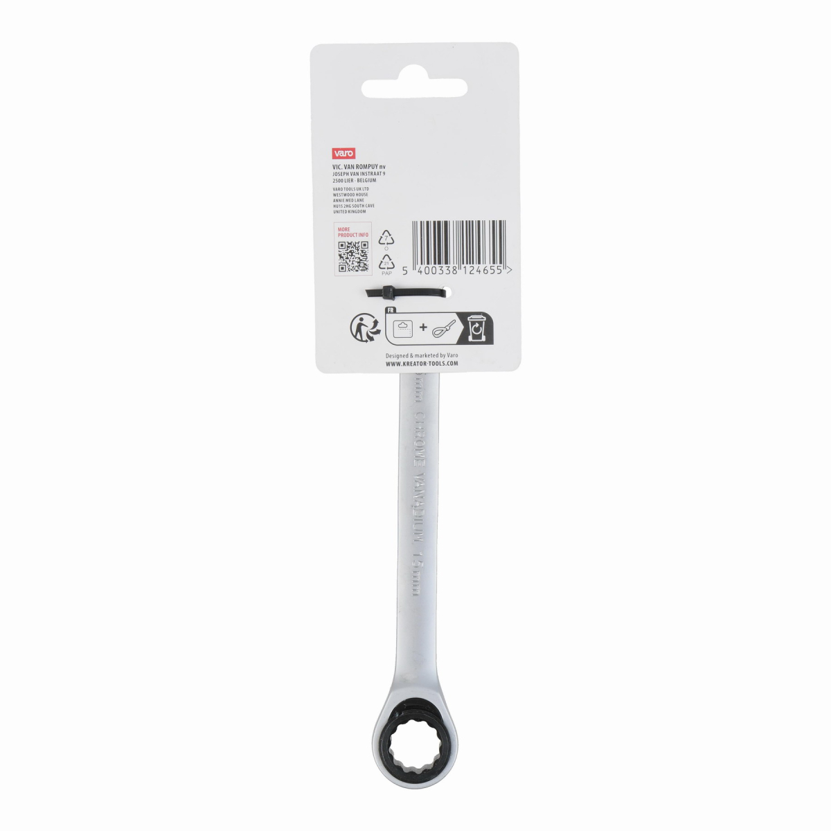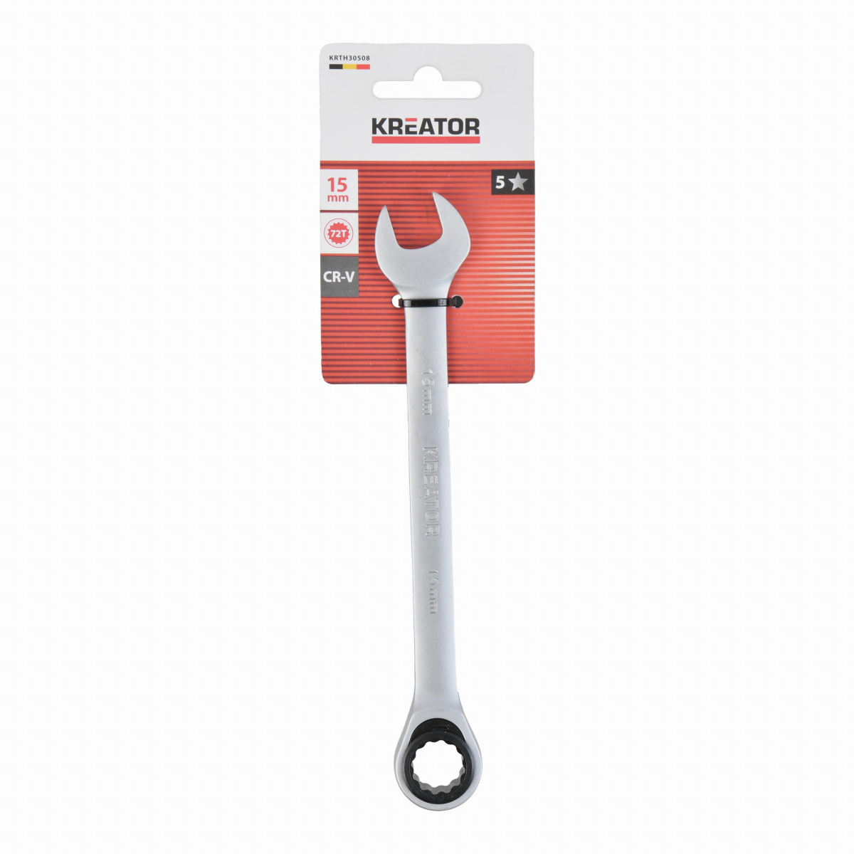 Tento kombinovaný očko račňa / otvorený kľúč KRTH30508 značky Kreator je vyrobený z vysoko kvalitnej chróm-vanádiovej zliatiny. Dĺžka kľúča je 207 mm a má priemer 15 mm. Očko je opatrené kvalitným strojčekom, ktorý má 72 zubov.