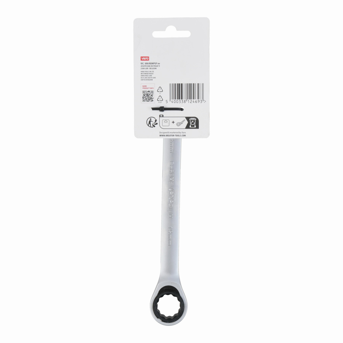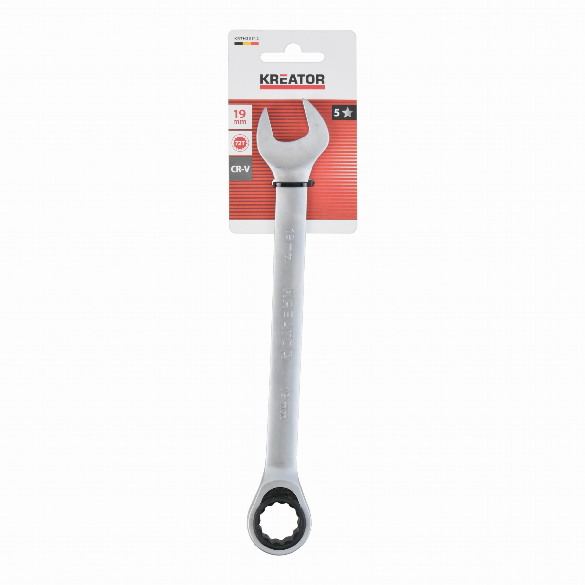 Tento kombinovaný očko račňa / otvorený kľúč KRTH30512 značky Kreator je vyrobený z vysoko kvalitnej chróm-vanádiovej zliatiny. Dĺžka kľúča je 238 mm a má priemer 19 mm. Očko je opatrené kvalitným strojčekom, ktorý má 72 zubov.