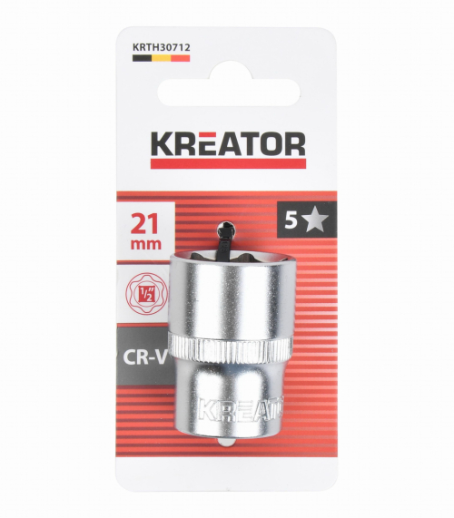 Tento nástrčný klíč KRTH30712 od Kreator o rozměru 21mm použijte k povolování nebo utahování matic a šroubů. Nástrčný klíč je vyroben z robustní chrom-vanadiové slitiny a má upínací velikost 1/2".