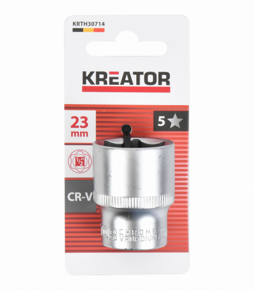 Tento nástrčný klíč KRTH30714 od Kreator o rozměru 23mm použijte k povolování nebo utahování matic a šroubů. Nástrčný klíč je vyroben z robustní chrom-vanadiové slitiny a má upínací velikost 1/2".