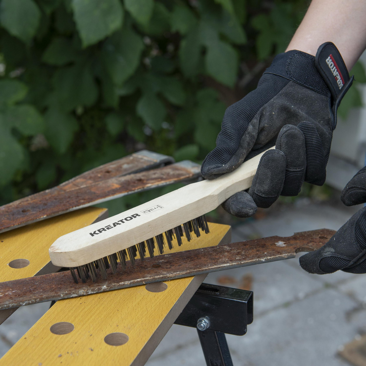 Táto drevená drôtená kefa KRTH50002 z nášho radu Kreator má 56 radov oceľových štetín na odstránenie nečistôt a hrdze z kovu. Po použití môžete kefu zavesiť pomocou praktického závesného očka na rukoväti. Protišmyková rukoväť zaisťuje pevný úchop a je ako telo vyrobené z dreva s certifikáciou FSC®.