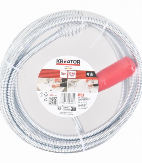Toto čistiace preťahovacie pero KRTH50301 značky Kreator na odpad má dĺžku 3 m a priemer 10 mm a je vyrobené z veľmi kvalitnej uhlíkovej ocele. Je vybavené malým vŕtacím hrotom, ktorý rýchlo prerazí upchávku a ľahko uvoľní upchatý odtok.