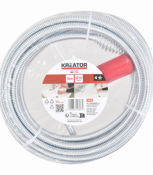 Toto čistiace preťahovacie pero KRTH50302 značky Kreator na odpad má dĺžku 5 ma priemer 10 mm a je vyrobené z veľmi kvalitnej uhlíkovej ocele. Je vybavené malým vŕtacím hrotom, ktorý rýchlo prerazí upchávku a ľahko uvoľní upchatý odtok.