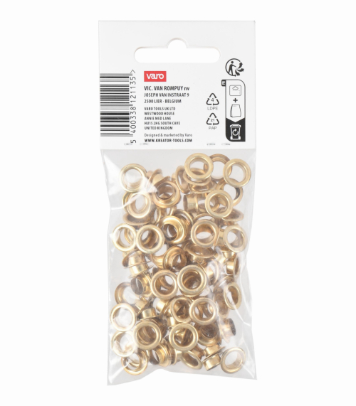Tieto nitovacie očká KRTH62505 od Kreator majú vnútorný priemer 7 mm a je možné ich pripevniť k textíliám a iným tenkým materiálom pomocou klieští na nitovacie očká.