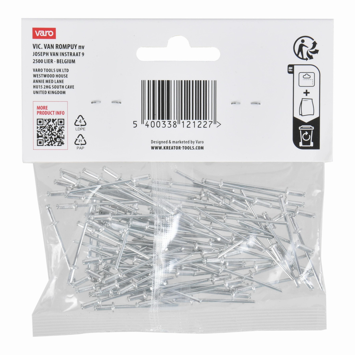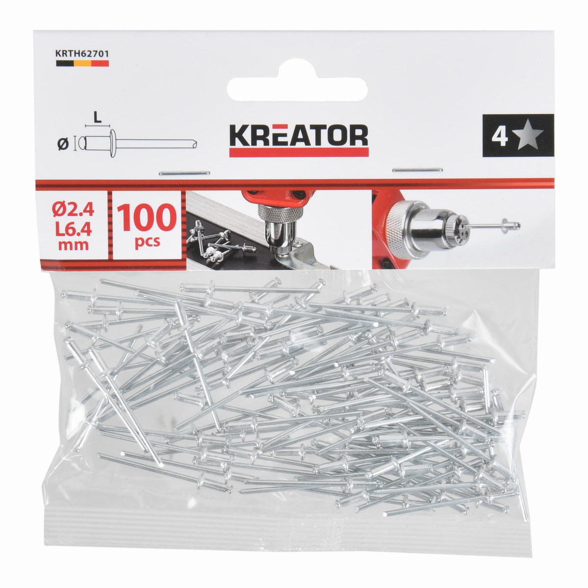 Tieto trhacie nity KRTH62701 z nášho radu Kreator majú priemer 2,4 mm. Používajte ich na rýchle a bezskrutkové spojenie kovových, hliníkových alebo plastových predmetov s hrúbkou až 3 mm. To sa vykonáva pomocou nitovacích klieští. Balenie obsahuje 100ks.