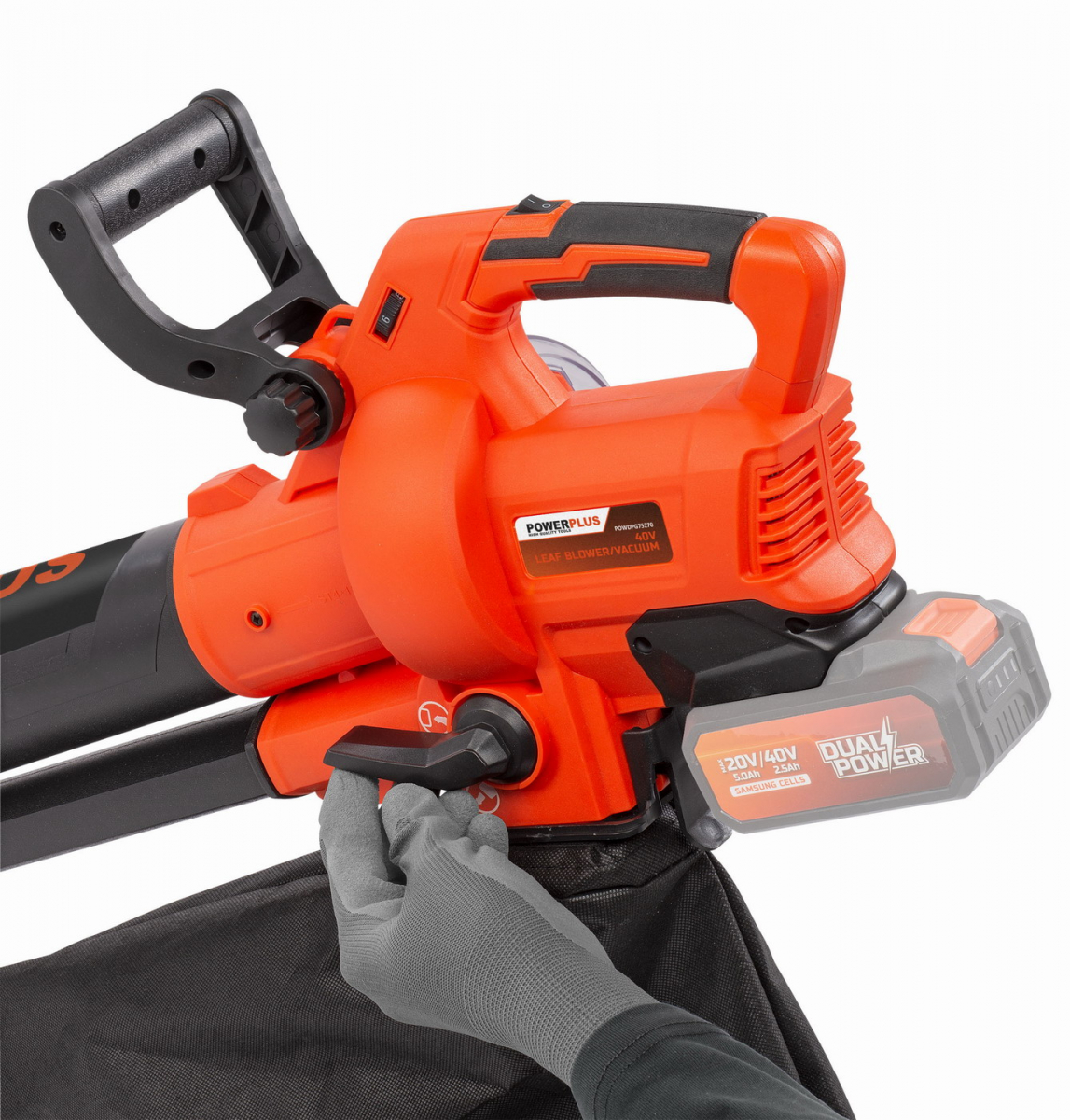 Akumulátorový 40V vysávač a fúkač lístia POWDPG75270 Powerplus ponúka plnú voľnosť pohybu, bez prekážok predlžovacích káblov. Jeho silný bezuhlíkový motor poskytuje viac energie a zvyšuje funkčnosť batérie. Navyše potrebuje len malú údržbu. Fúkač lístia má šesť rýchlostí fúkania, maximálne 210 km / h a objem vzduchu až 9,5 m3 / min. To stačí na odstránenie i mokrých a zaseknutých listov. Po použití možno trojdielnou trubicu ľahko rozložiť, takže POWDPG75720 možno skladovať priestorovo úsporne. Okrem funkcie fúkania je nástroj Dual Power vybavený aj režimom sania. Vstavaný drvič drví vysávaný záhradný odpad ako opadané lístie a trávu v pomere 15: 1. skartovanie odpad je následne chytený do 45l zberného vaku. Vďaka elektronickej regulácii rýchlosti a bezpečnostnému zámku je fúkač lístia veľmi bezpečným nástrojom. Je vybavený ergonomickým mäkkým úchopom a ľahko sa udržiava a čistí. Rúrka je podopretá dvoma kolieskami, zachytávajú najväčšiu časť hmotnosti stroja a pri používaní preto chráni chrbát používateľa. Použitie iba so 40V batériami zo série DualPower.
