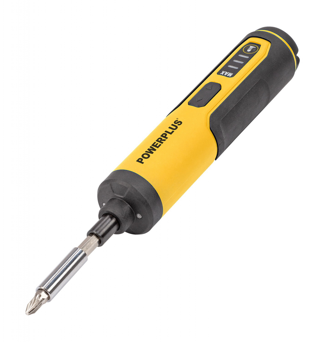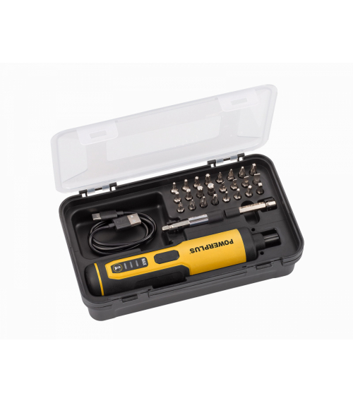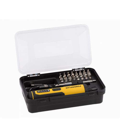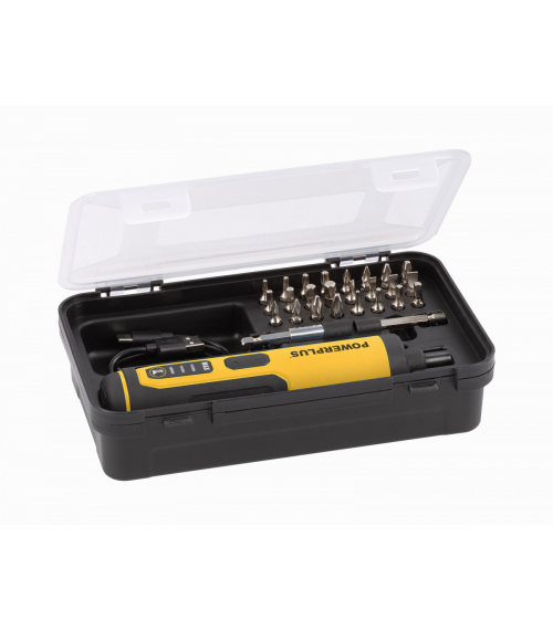 Powerplus POWX00420 je akumulátorový 4V skrutkovač pre menšie kutilské práce. V tvare ručného skrutkovača sa pohodlne používa a zmestí sa priamo do vrecka. Všestranný skrutkovač je kompaktný, napriek tomu veľmi výkonný s kapacitou batérie 1300 mAh. Ťažká práca v stiesnených priestoroch teda nie je žiadny problém a 3 LED pracovné svetlá vám dobre poslúžia v úzkych, zle osvetlených priestoroch. Jednoduchým prepnutím otáčania doprava alebo doľava môžete skrutky utiahnuť alebo povoliť. 3 polohy krútiaceho momentu (max. 4 Nm) poskytujú potrebnú kontrolu, takže môžete vždy použiť ten najlepší krútiaci moment pre váš projekt. Vstavaný držiak bitov urýchľuje proces výmeny bitov. POWX00420 môžete nabíjať pomocou dodaného USB kábla. Nielen, že je tento kompaktný skrutkovač dodávaný v praktickom kufríku, ale taktiež obsahuje 25 skrutkovacích bitov, takže sa môžete bez meškania pustiť do práce.