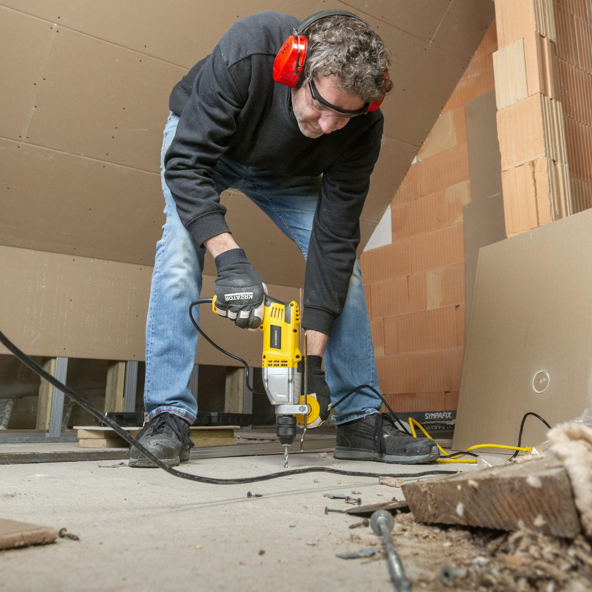 Používajte túto príklepovú vŕtačku s výkonom 1200 W na vŕtanie otvorov do tvrdých materiálov, ako je drevo, oceľ a betón. Môžete ju použiť na vŕtanie a vŕtanie s príklepom. Dokáže vŕtať až 13 mm do ocele, 20 mm do betónu a až 45 mm do dreva.