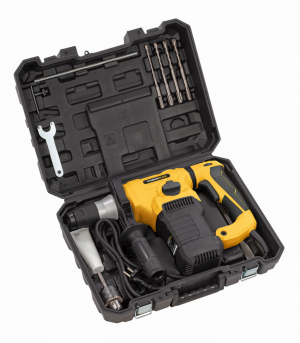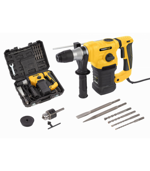 Vŕtanie, príklepové vŕtanie alebo kosenie je hračka vďaka kombinovanému kladivu POWX1197 od Powerplus s príkonom 1.500W. Môžete vŕtať do dreva, kovu, keramiky a plastu, môžete vŕtať s príklepom do betónu, tehál a kameňa a taktiež vykonávať ľahké sekanie. Toto robustné kladivo pracuje rýchlosťou až 4 000 úderov za minútu s maximálnou kapacitou vŕtania Ø 40 mm do dreva, Ø 32 mm do betónu a Ø 13 mm do ocele. Pri využití všetkého výkonu systém redukcie vibrácií zaisťuje, že môžete pracovať pohodlne bez akýchkoľvek nepríjemných vibrácií. Navyše je POWX1197 vybavený protiprachovou krytkou pre minimalizáciu prachu a ďalšou odnímateľnou rukoväťou s mäkkou rukoväťou pre ešte väčšie pohodlie pri práci. Hĺbkový doraz zaručuje jednotnú hĺbku pre každú skrutku. Aby ste sa mohli okamžite pustiť do práce, sú súčasťou tejto príklepovej vŕtačky 4 vrtáky Ø 6-8-10-15 x 150 mm. Dodáva sa aj s kľúčom, plochým sekáčom, špicatým sekáčom, skľučovadlom na kľúče s adaptérom typu SDS a nádobou na tuk a to všetko v praktickom kufri.