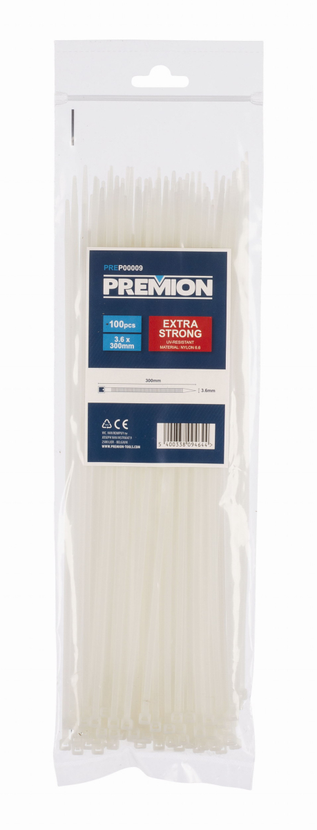 Táto sada PREP00009 od Premion obsahuje 100 ks bielych nylonových sťahovacích pások 3,6 x 300 mm. Tieto extra pevné sťahovacie pásky majú vysokú pevnosť v ťahu. Použite ich k úhľadnému zviazaniu káblov alebo k ľahkému vzájomnému spojeniu predmetov. Úhľadne ukryte káble a vodiče napríklad vo svojej kancelárii alebo dielni tým, že ich zviažete pomocou týchto káblových sťahovacích pásikov. Navyše sú tieto sťahovacie pásky odolné voči UV žiareniu.