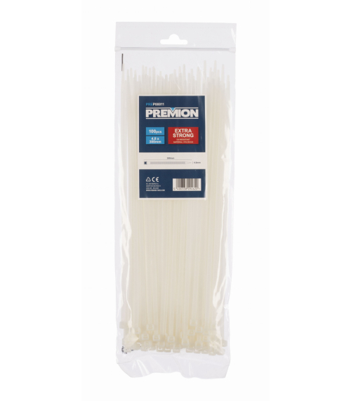 Táto sada PREP00011 značky Premion obsahuje 100 ks bielych nylonových sťahovacích pások 4,8 x 300 mm. Tieto extra pevné sťahovacie pásky majú vysokú pevnosť v ťahu. Použite ich k úhľadnému zviazaniu káblov alebo k ľahkému vzájomnému spojeniu predmetov. Úhľadne ukryte káble a vodiče napríklad vo svojej kancelárii alebo dielni tým, že ich zviažete pomocou týchto káblových sťahovacích pásikov. Navyše sú tieto sťahovacie pásky odolné voči UV žiareniu.