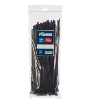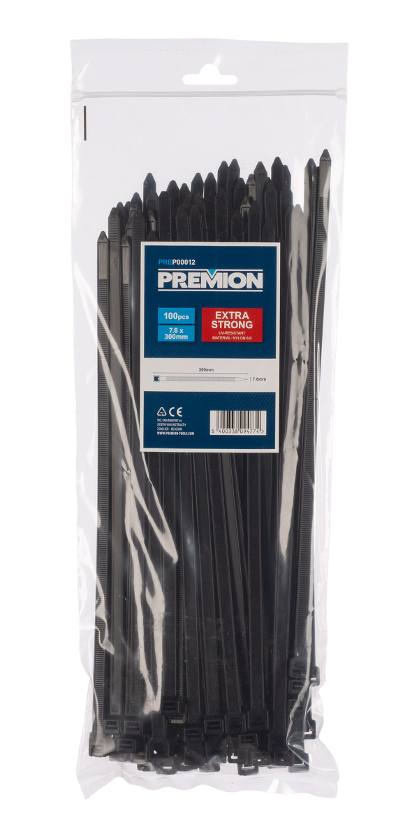 Táto sada PREP00012 od Premion obsahuje 100 ks čiernych nylonových sťahovacích pások 7,6 x 300 mm. Tieto extra pevné sťahovacie pásky majú vysokú pevnosť v ťahu. Použite ich k úhľadnému zviazaniu káblov alebo k ľahkému vzájomnému spojeniu predmetov. Úhľadne ukryte káble a vodiče napríklad vo svojej kancelárii alebo dielni tým, že ich zviažete pomocou týchto káblových sťahovacích pásikov. Navyše sú tieto sťahovacie pásky odolné voči UV žiareniu.