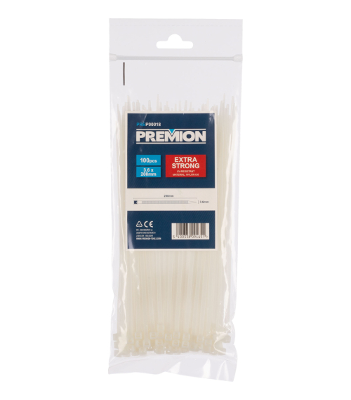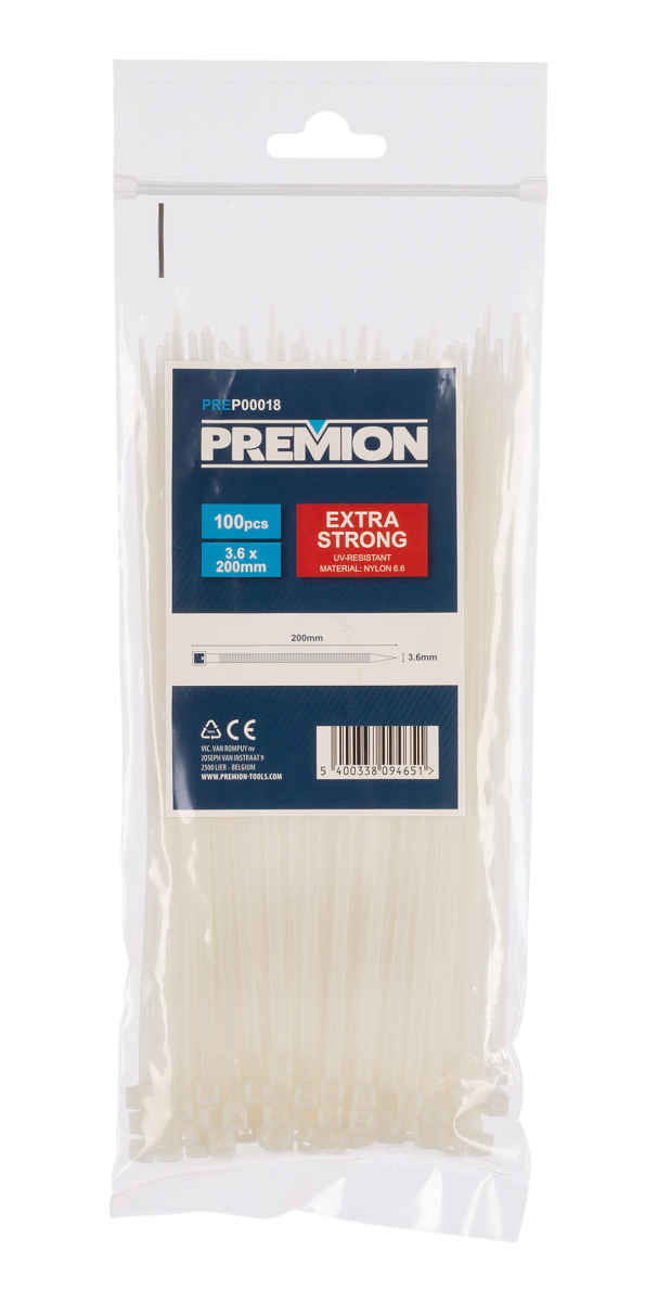 Táto sada PREP00018 značky Premion obsahuje 100 ks bielych nylonových sťahovacích pások 3,6 x 200 mm. Tieto extra pevné sťahovacie pásky majú vysokú pevnosť v ťahu. Použite ich k úhľadnému zviazaniu káblov alebo k ľahkému vzájomnému spojeniu predmetov. Úhľadne ukryte káble a vodiče napríklad vo svojej kancelárii alebo dielni tým, že ich zviažete pomocou týchto káblových sťahovacích pásikov. Navyše sú tieto sťahovacie pásky odolné voči UV žiareniu.
