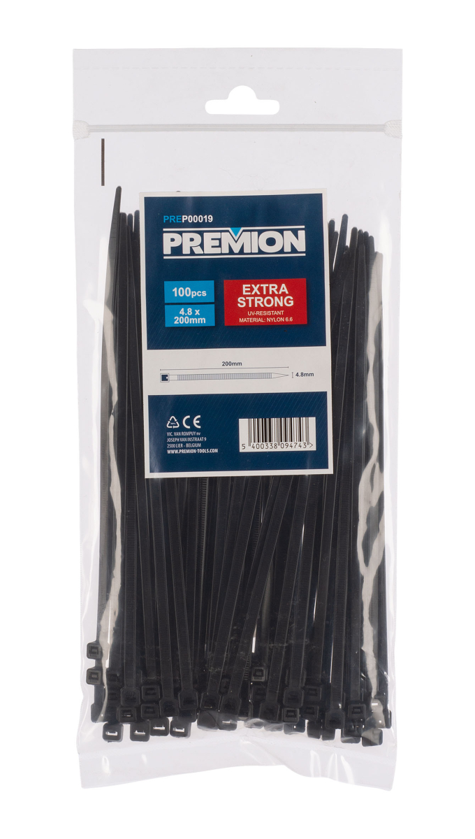 Táto sada PREP00019 od Premion obsahuje 100 ks čiernych nylonových sťahovacích pások 4,8 x 200 mm. Tieto extra pevné sťahovacie pásky majú vysokú pevnosť v ťahu. Použite ich k úhľadnému zviazaniu káblov alebo k ľahkému vzájomnému spojeniu predmetov. Úhľadne ukryte káble a vodiče napríklad vo svojej kancelárii alebo dielni tým, že ich zviažete pomocou týchto káblových sťahovacích pásikov. Navyše sú tieto sťahovacie pásky odolné voči UV žiareniu.