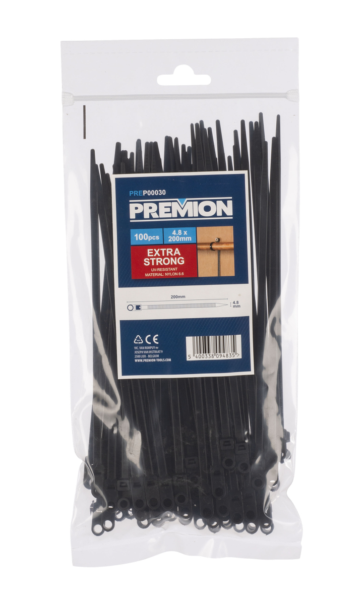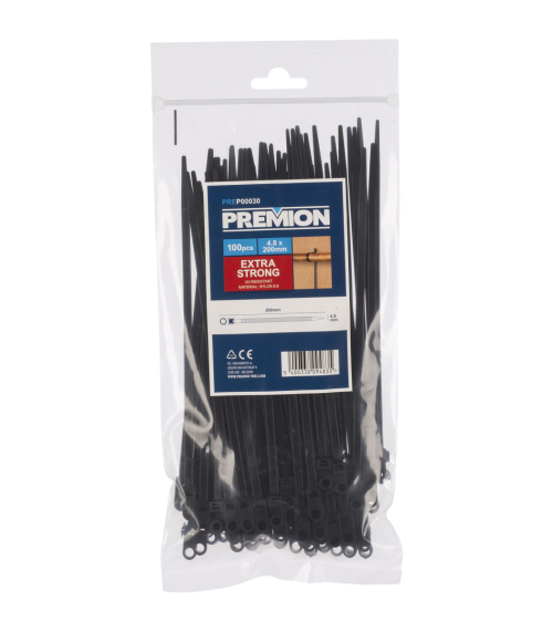Táto sada PREP00030 od Premion obsahuje 100 ks čiernych nylonových sťahovacích pások 4,8 x 200 mm s otvorom. Tieto extra pevné sťahovacie pásky majú vysokú pevnosť v ťahu. Použite ich k úhľadnému zviazaniu káblov alebo k ľahkému vzájomnému spojeniu predmetov. Úhľadne ukryte káble a vodiče napríklad vo svojej kancelárii alebo dielni tým, že ich zviažete pomocou týchto káblových sťahovacích pásikov. Navyše sú tieto sťahovacie pásky odolné voči UV žiareniu.