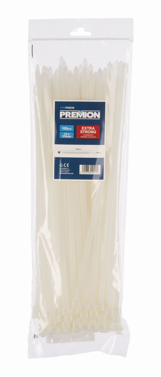 Táto sada PREP00038 od Premion obsahuje 100 ks bielych nylonových sťahovacích pások 7,6 x 370 mm. Tieto extra pevné sťahovacie pásky majú vysokú pevnosť v ťahu. Použite ich k úhľadnému zviazaniu káblov alebo k ľahkému vzájomnému spojeniu predmetov. Úhľadne ukryte káble a vodiče napríklad vo svojej kancelárii alebo dielni tým, že ich zviažete pomocou týchto káblových sťahovacích pásikov. Navyše sú tieto sťahovacie pásky odolné voči UV žiareniu.