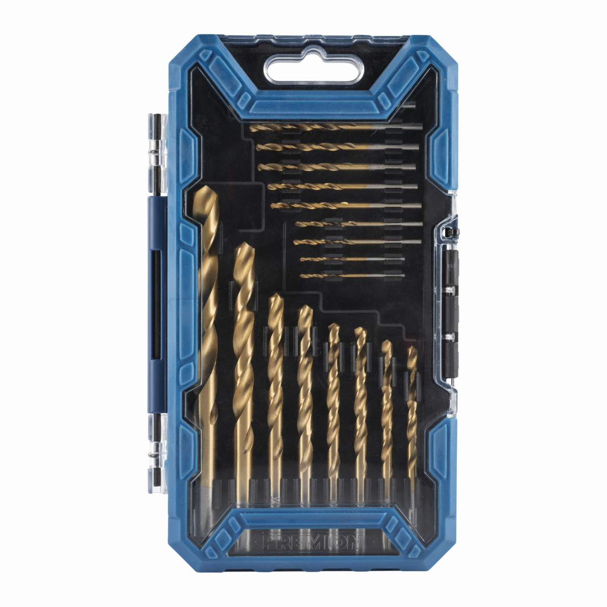 Táto sada PRER00024 značky Premion obsahuje 18ks vrtákov HSS s titánovým povrchom, ktorý zvyšuje odolnosť vrtákov. Tieto vrtáky sú ideálne na vŕtanie do tvrdých materiálov, ako je kov. Sada je dodávaná v praktickom úložnom kufríku a je kompatibilná s väčšinou vŕtačiek.